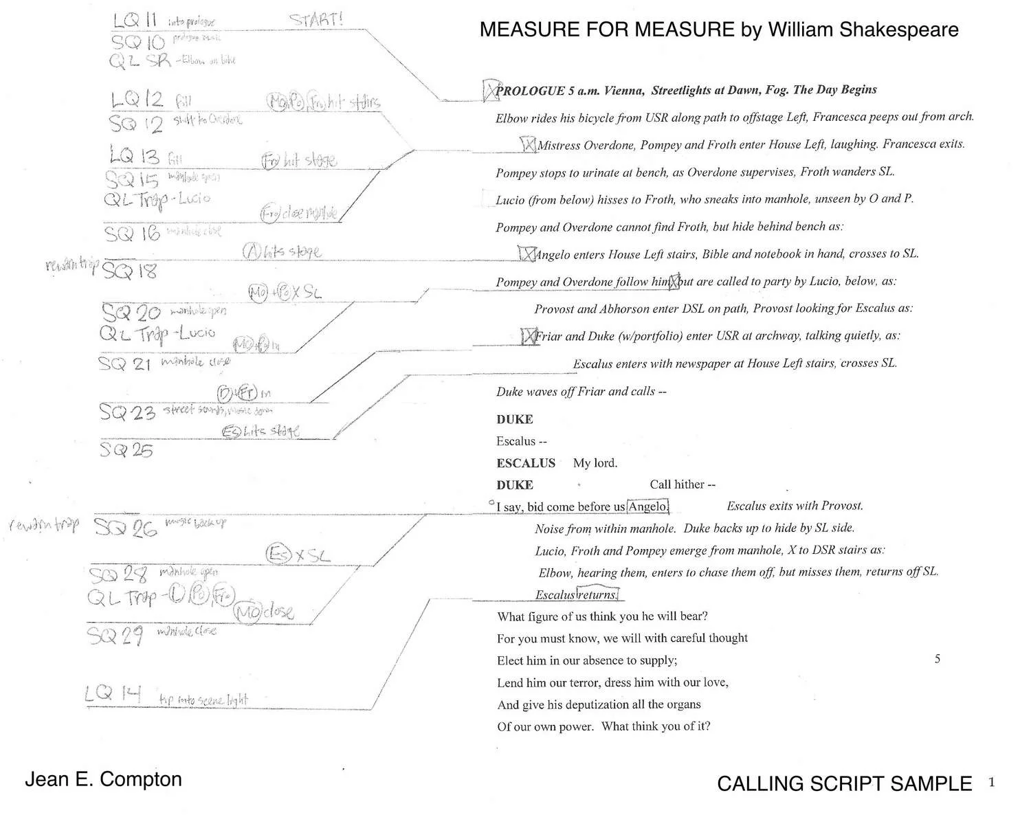 Calling Script Sample for the prologue of Measure for Measure by William Shakespeare, Directed by Catherine Weidner, lighting design by Garvin Jellison, and sound design by Nick Keenan.