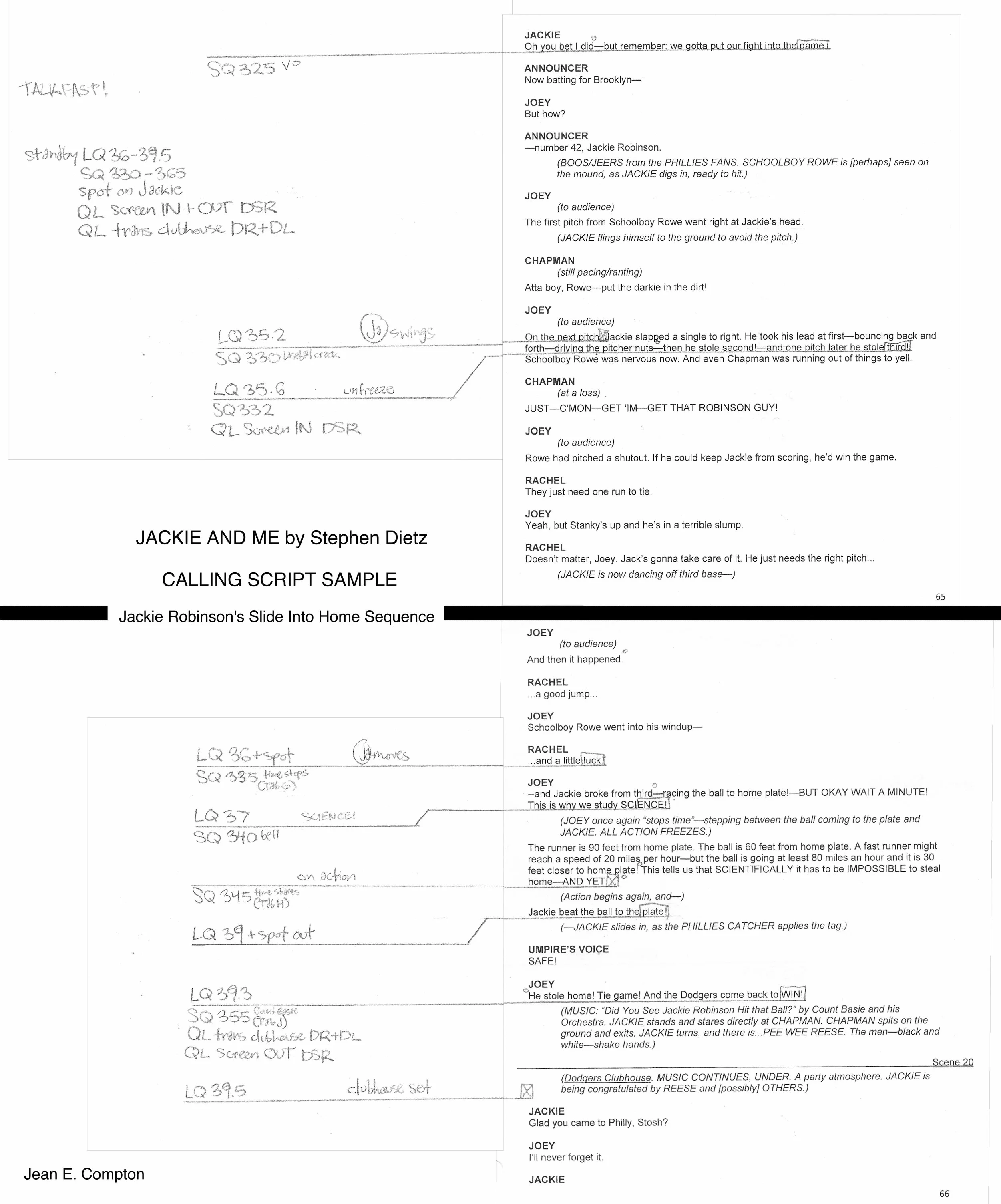 Calling Script Sample for the precisely choreographed and visually timed slide-into-home sequence in Jackie and Me by Steven Dietz. Directed by John Jenkins, lighting design by Bailey Rosa, sound design by Matt Reich, and projection design by Shane Kelly.