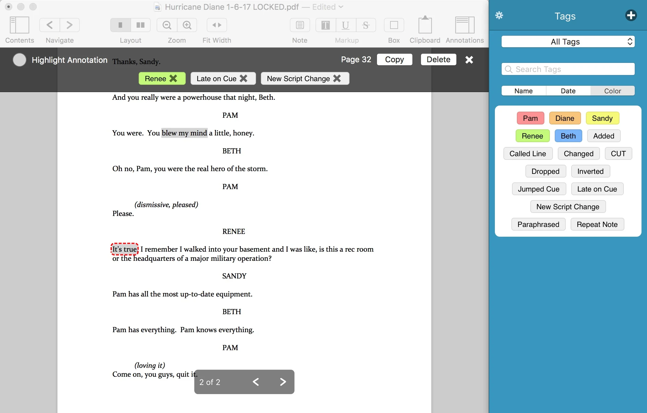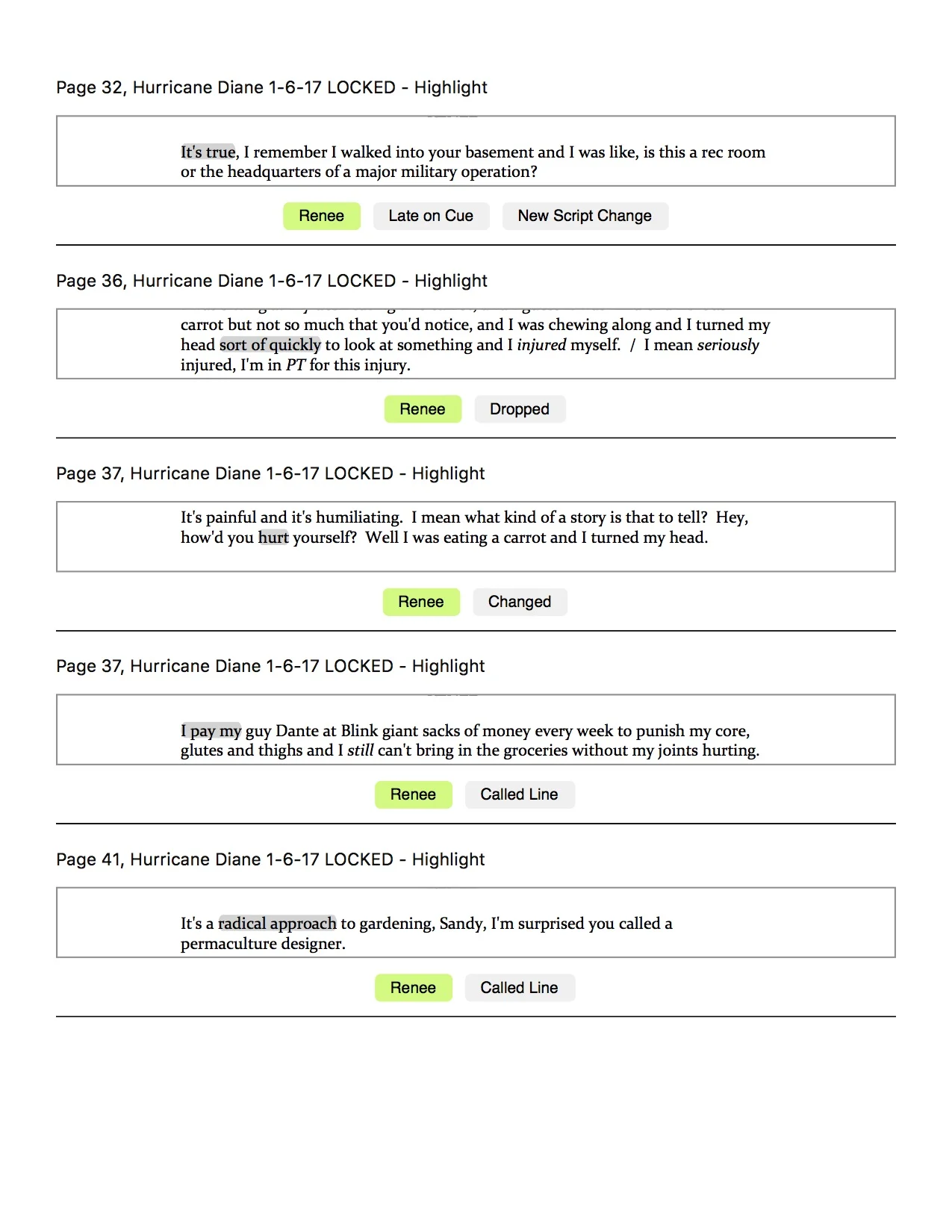 Line Notes using TagNotate. Example from Hurricane Diane by Madeleine George. I'm interested in finding and utilizing technology to make my work more efficient, and TagNotate has been an absolute gamechanger. I can be on book and simultaneously take line notes, then print or email them to actors immediately following a run. Track progress across multiple runs of a classic script, or quickly upload and work from the latest draft of a world premiere in progress.